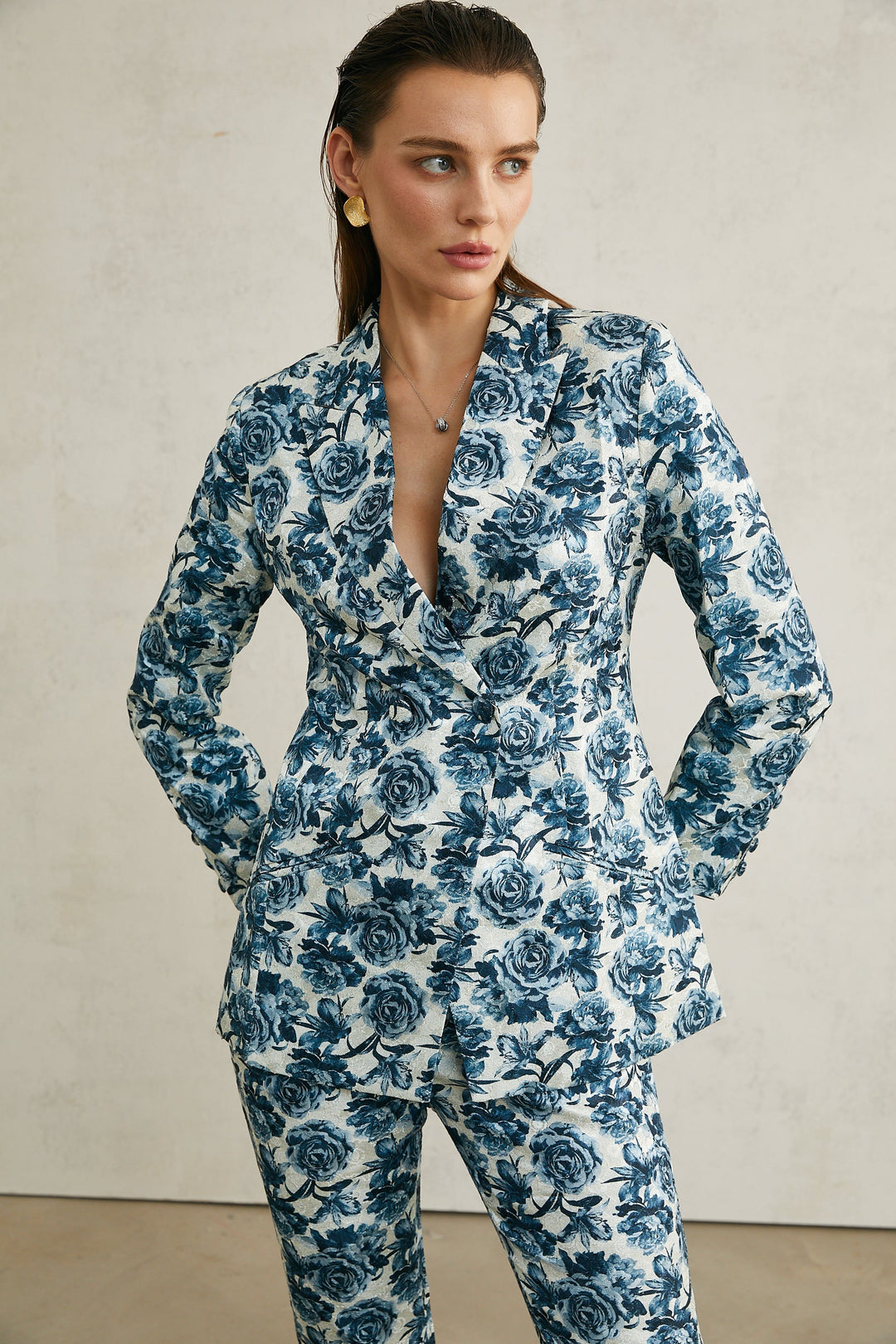 Morgane Çiçek Desenli Ceket Ve Pantolon Uyumlu Set Mavi