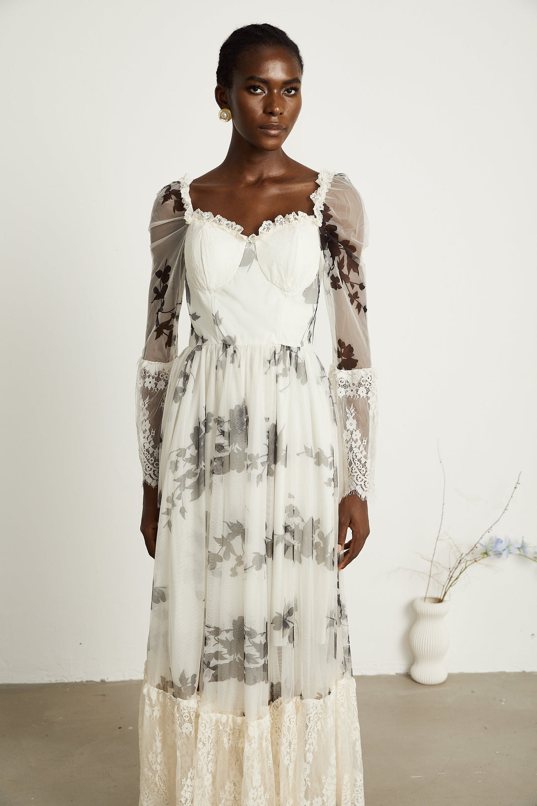 Théa Çan Kollu Çiçekli Dantel Panelli Maxi Elbise Beyaz