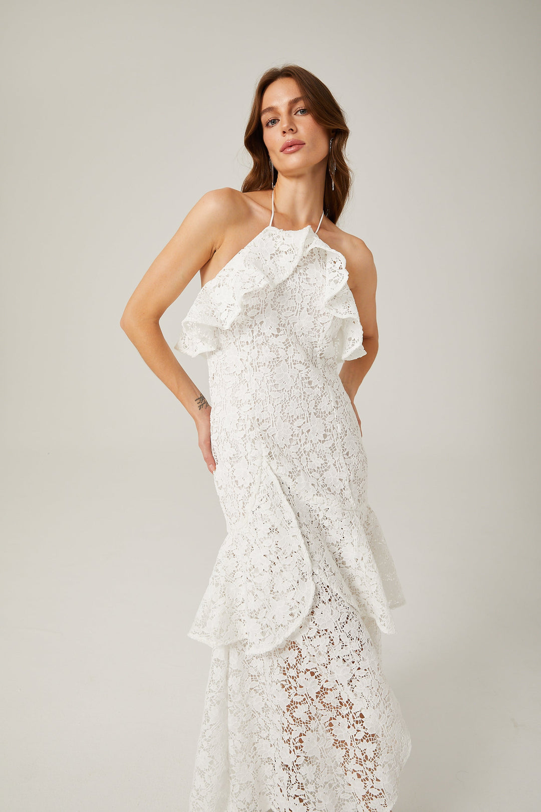 Sancia Beyaz Fırfırlı Güpür Dantelli Boyundan Bağlamalı Elbise Beyaz