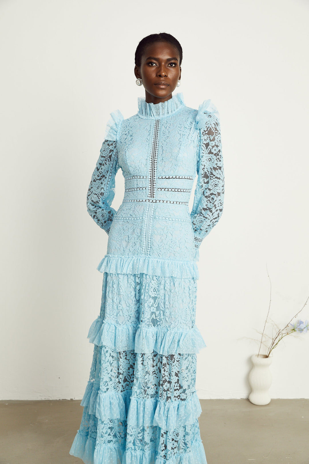 Sabine Mavisi Dantel Katlı Maxi Elbise Mavi