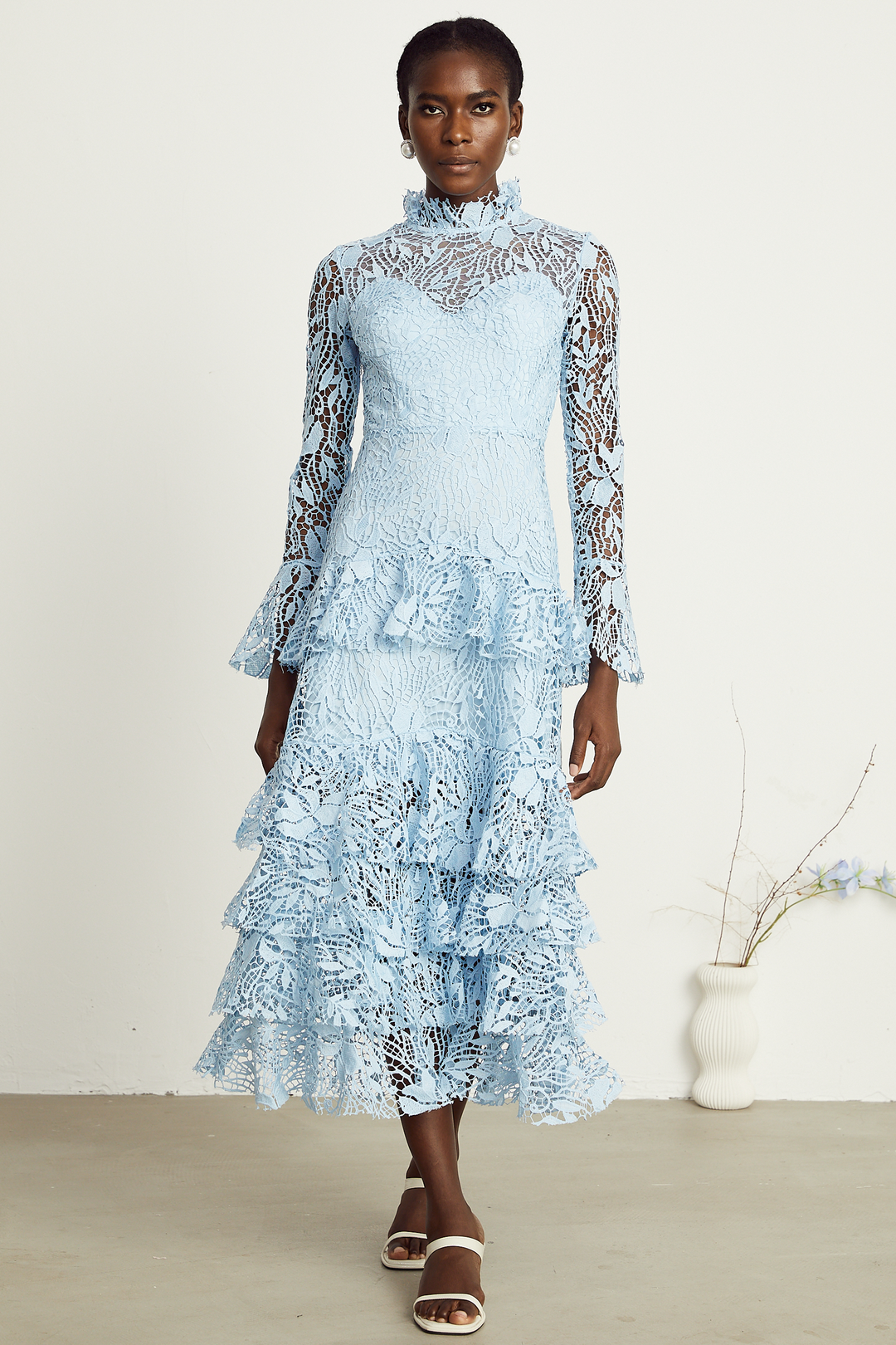 Pascale Mavi Güpür Dantelli Fırfırlı Katmanlı Midi Elbise Mavi