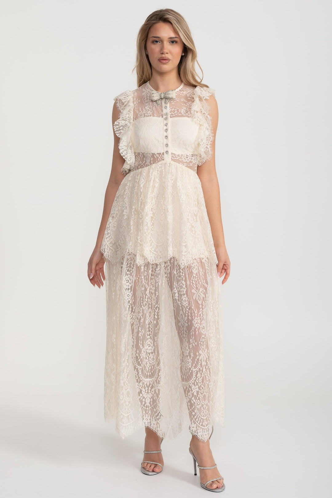 Alley Fırfırlı Dantelli Şeffaf Elbise - Fildişi