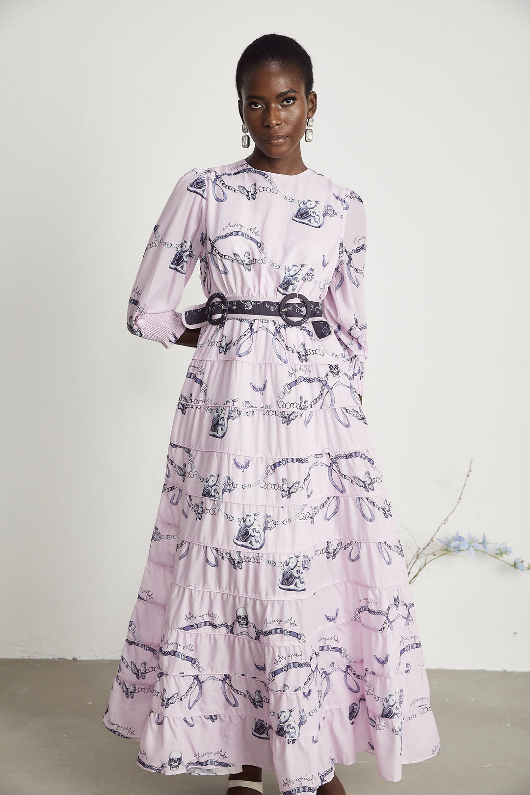 Vittoria Grafik Desenli Kemerli Midi Elbise Mor