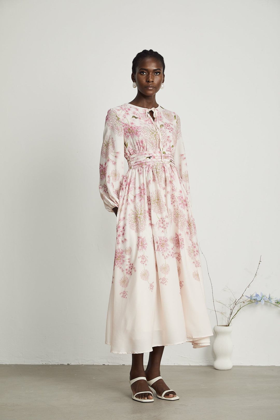 Vivien Çilek Desenli Asimetrik Midi Elbise Beyaz