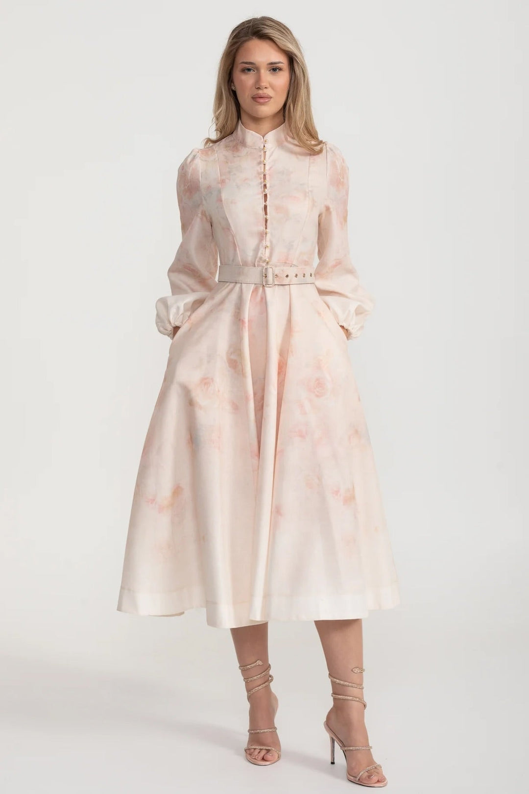 Suluboya Çiçekli Kemerli Midi Elbise Mandarin Yakalı