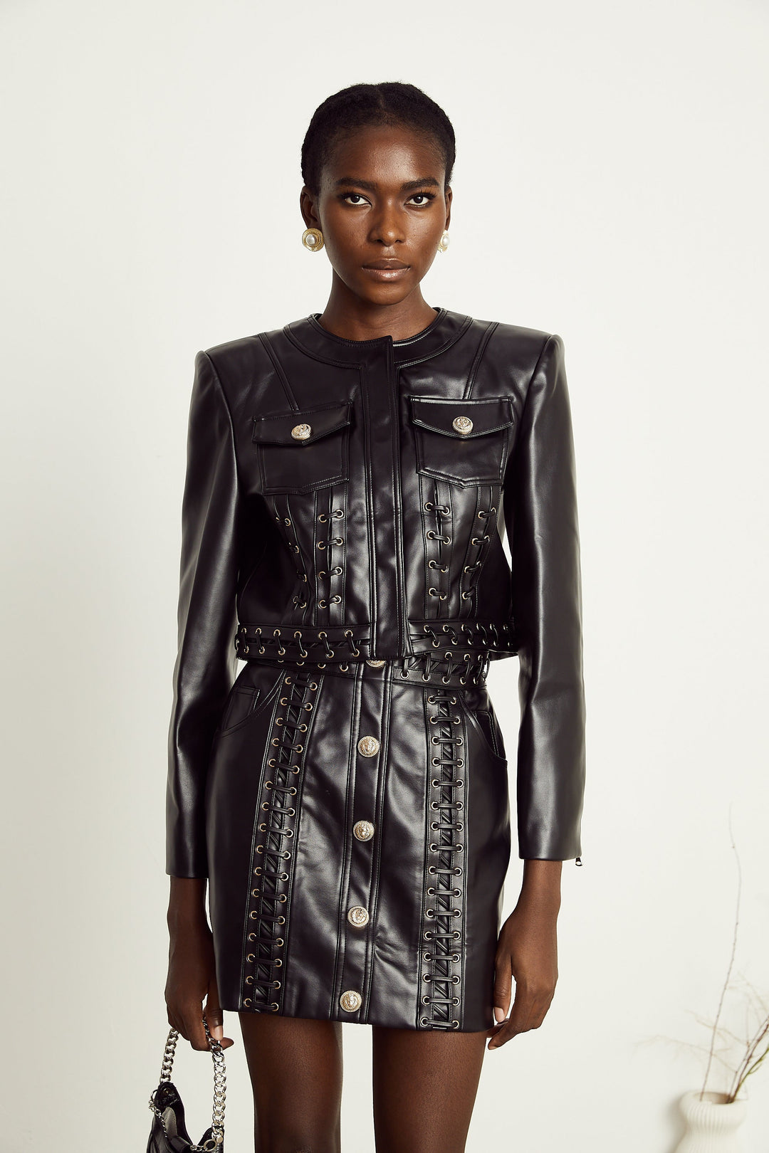 Daphné Kuşgözü Süslemelerili Deri Ceket & Etek Eşleştirme Seti Siyah