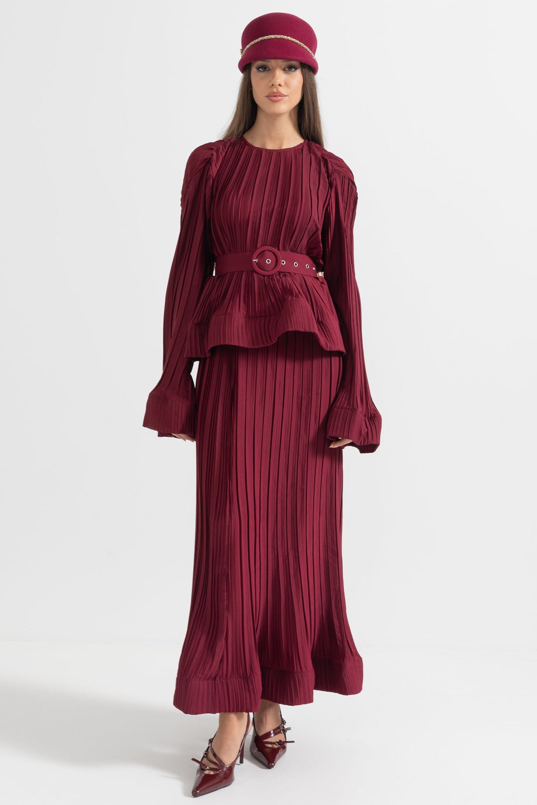 Pileli Üst ve Uzun Etekli Şık Kombin - Bordo