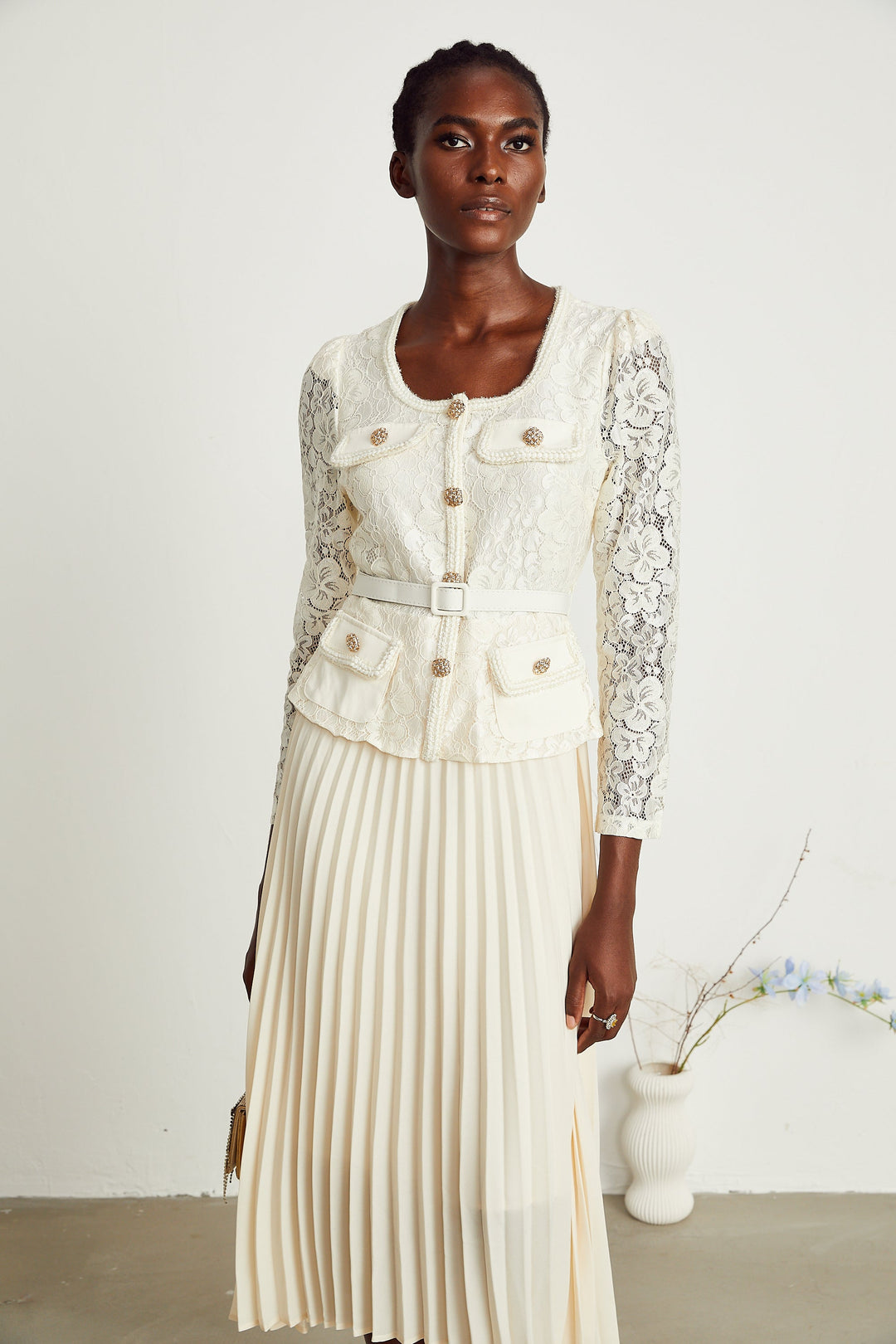 • Model 1.77 m boyunda ve M beden giyiyor • Beyaz kapalı • Tüvit • Kare boyun • Uzun yarı şeffaf kollar • Çiçekli dantel işlemeler • Plise detayları • Örgülü kenar • Kabartmalı düğmeler • İki kapaklı cep • Kemerli bel • Kısmi...- 5,799.99TL