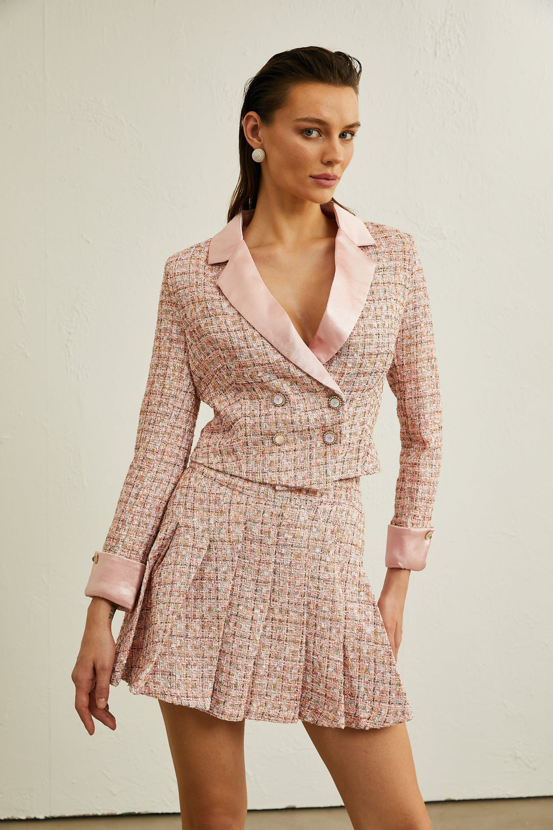 Hélène Pembe Kristal Kareli Tüvit Blazer Ceket Pembe