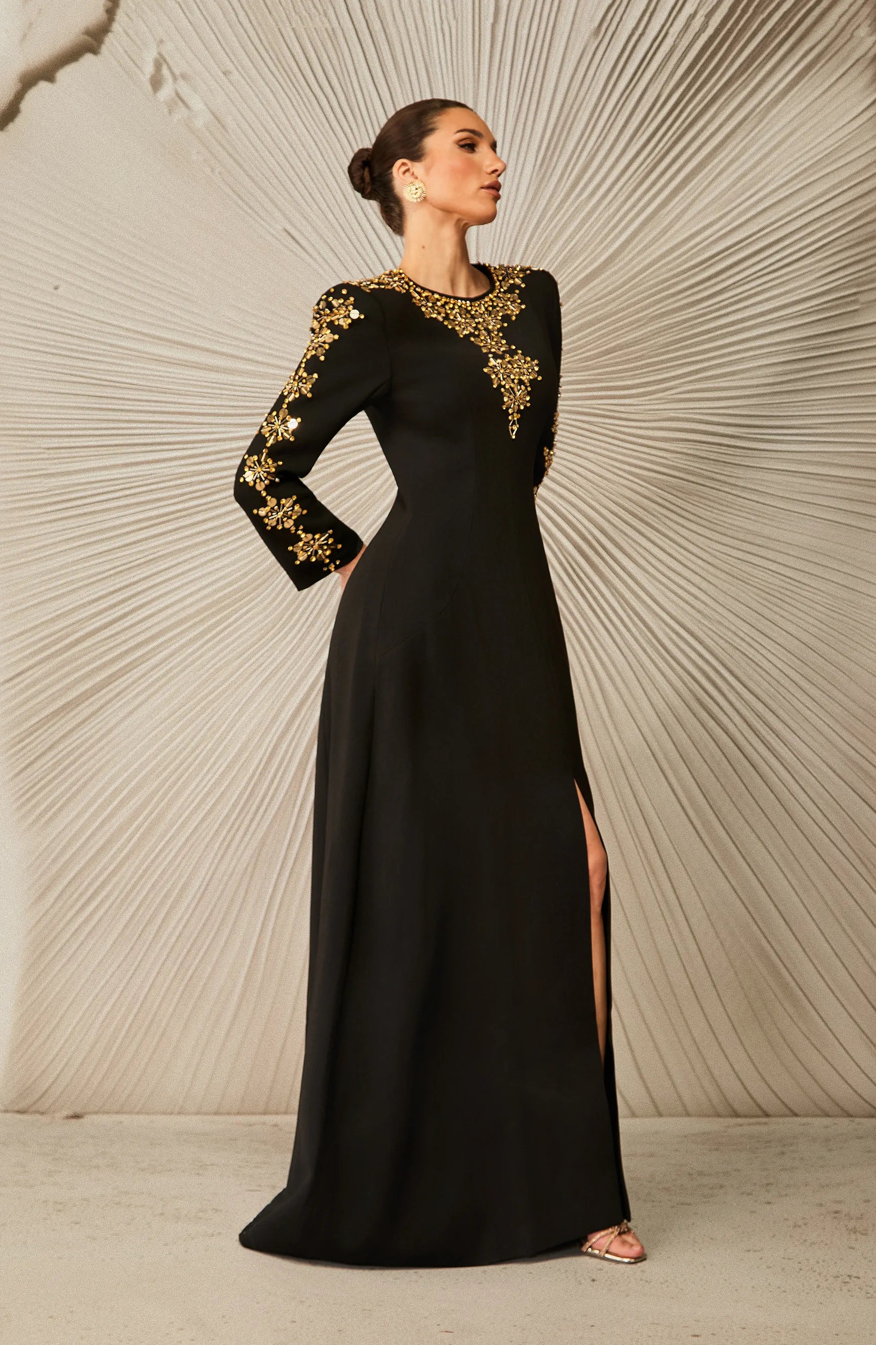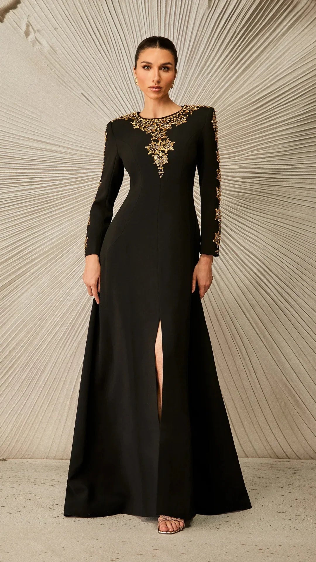 Bu çarpıcı siyah elbise, A kesim silueti ve zarif uzun kolları ile dikkat çekiyor. Yaka ve manşetlerde karmaşık altın süslemeler yer alıyor.